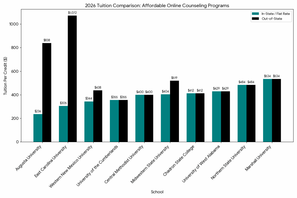 For a 60-credit, licensure-track online master’s in clinical mental health counseling (CMHC), “affordable” tuition in 2026 ranges from $236 to $534 per credit. However, the most cost-effective path is now defined by Flat-Rate Tuition—where out-of-state students pay the same as residents—and programs with Integrated Certification (e.g., Telehealth or Trauma), which can save graduates thousands in post-grad specialization costs.